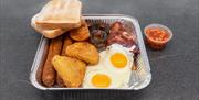 Delicious street food including breakfast rolls, breakfasts, burgers, hot dogs, salads and wraps plus hot drinks.