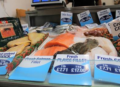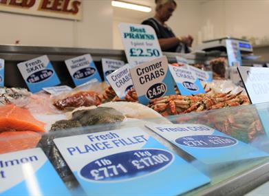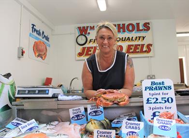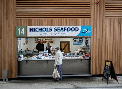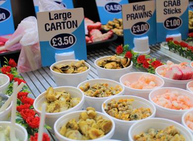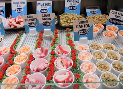 Nichols Seafood sells takeaway seafood snacks including prawns, crabsticks, mussels, whelks, lobsters, crabs and jellied eels.