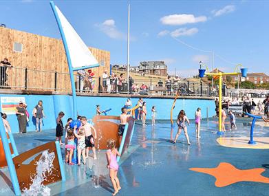 Splashpad at Gorleston-on-Sea near Great Yarmouth is a fun wet play area for children with fountain sprays, jet streams and buckets of tipping water all set within an ocean themed play area featuring a sail boat, seaweed and starfish.