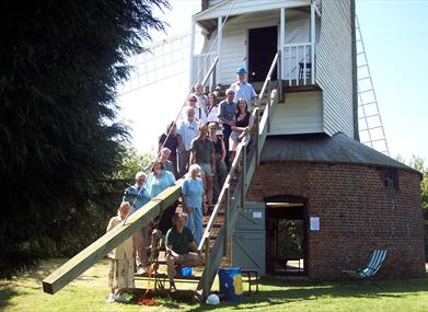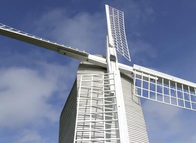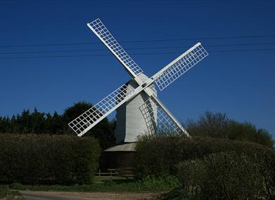A post mill of recent construction, almost complete, on the site of an earlier mill dating from the 1790s.
