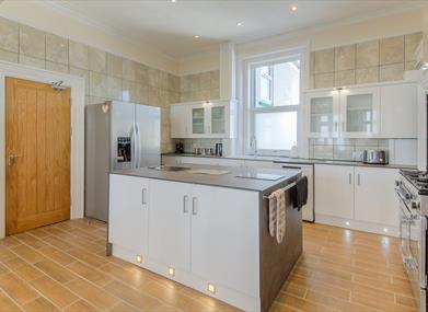 Second level: Large stylish kitchen fitted to an excellent high standard with white shiny work units with large work island, microwave, wine chiller, large range cooker, dishwasher and American style fridge freezer with ice maker. Dining Room area with a grand rosewood dining table with 12 chairs, fireplace, leather sofa and 2 arm chairs. 50 inch TV/freeview with DVD (DVDs and few games/books provided). French doors and windows with spectacular views of the sea and seafront.
