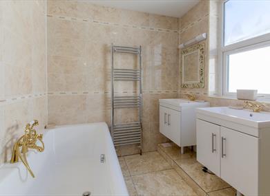 First level: Large family bathroom with walk in electric shower, two vanity washbasins and bath, separate WC and hand basin. Laundry area with washing machine and tumble dryer. Ironing board and Iron.