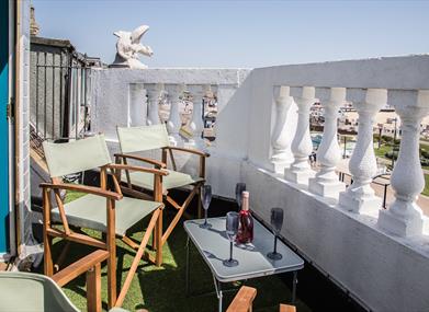 Fifth level:. Shower room with walk in shower, large vanity washbasin, wc and bluetooth speaker. Bedroom four – double bed with built in wardrobe and dressing table, hairdryer, TV, sea view. Bedroom Five – King size double bed with built in wardrobe, dressing table, hairdryer, TV. Door in bedroom leading to a small outside terrace area with magnificent views of sea and seafront. (Please note this is a small outside terrace area suitable for 2 to 4 people. We provide 2 sunloungers and 4 chairs which can either be used at one time).